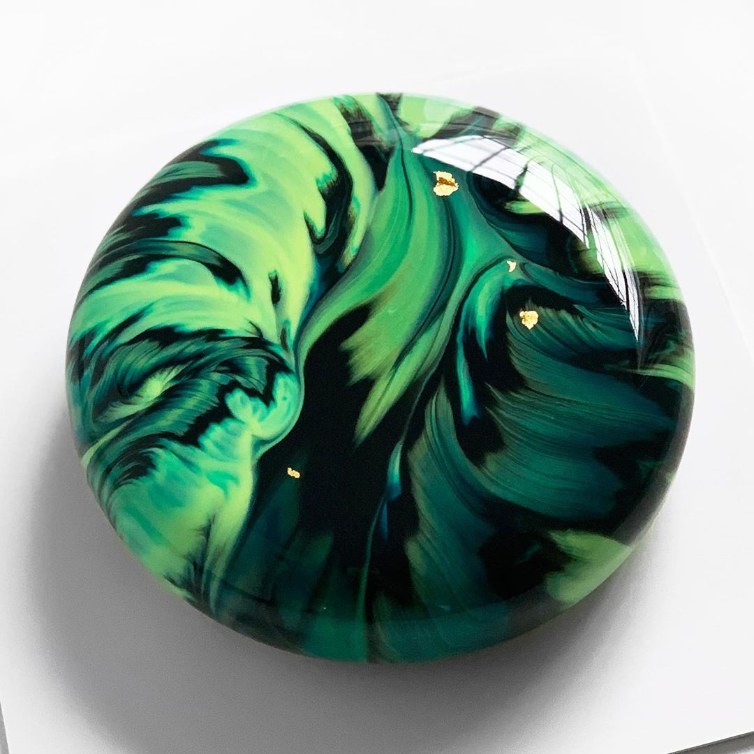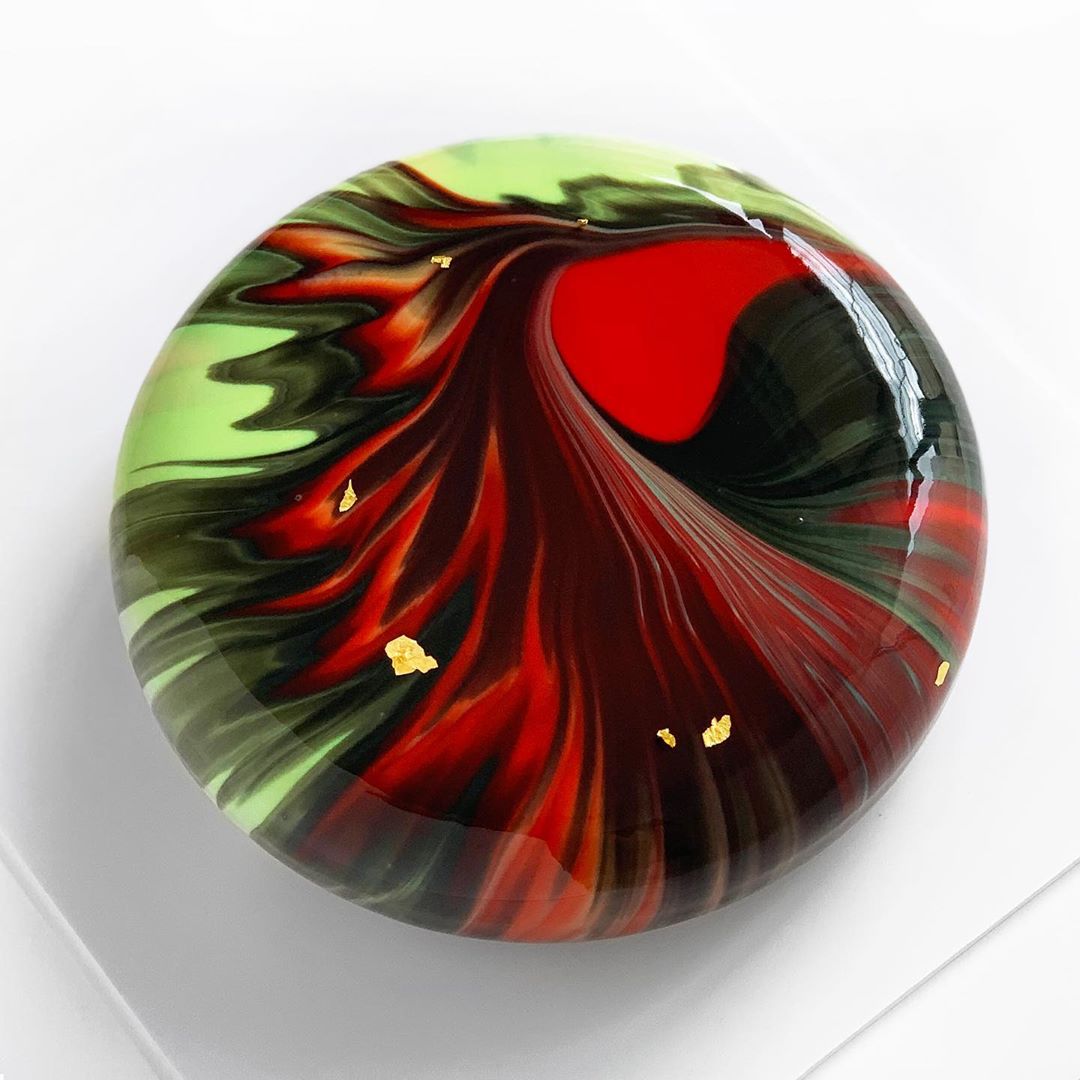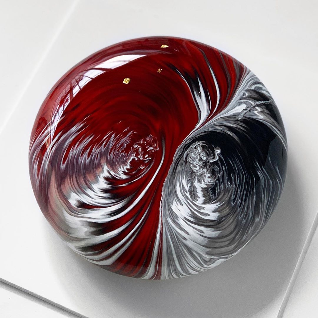 將糖漿淋在慕斯蛋糕的表面,經過特殊的處理後,蛋糕的表面將會光面如鏡,人們將之稱為“鏡面蛋糕”。來自哥斯達黎加聖何塞的魔幻色彩,讓蛋糕如著了魔一般……